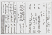老齢となってその職を辞し、郷里の日野に帰って医業のかたわら、日野商人に請われて道中の携帯薬として「五色袖珍方(ごしきしゅうちんほう)」という薬を与えました。それは五色の紙に、それぞれ粉薬を包んだものであったので、途中で破れる等不便でした。そこで携帯に便利で、しかも壊れないように扁平で半月形の丸薬としたところ、壊れにくく、しかもその効能が優れていることから、人々に大変喜ばれました。